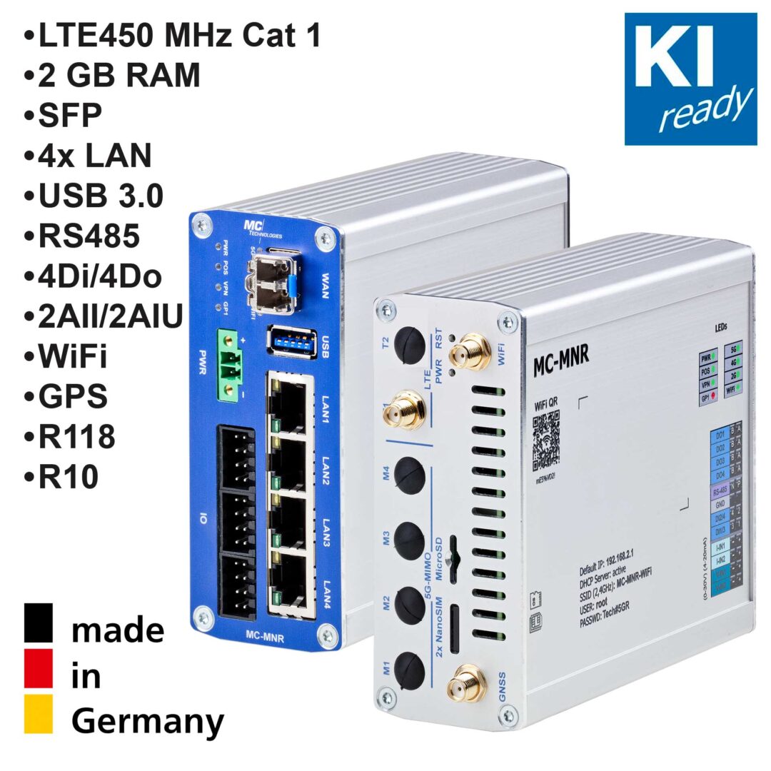 The MC MNR 450 4-Port Multi Network Router has been specially developed for demanding applications in industry and infrastructure. As an LTE450 MHz Cat 1 router, it offers reliable and uninterrupted data communication – ideal for controlling and monitoring decentralised systems. The Multi Network Router uses several mobile networks in parallel and ensures maximum availability and stable connections thanks to mobile network redundancy, even in critical infrastructures.