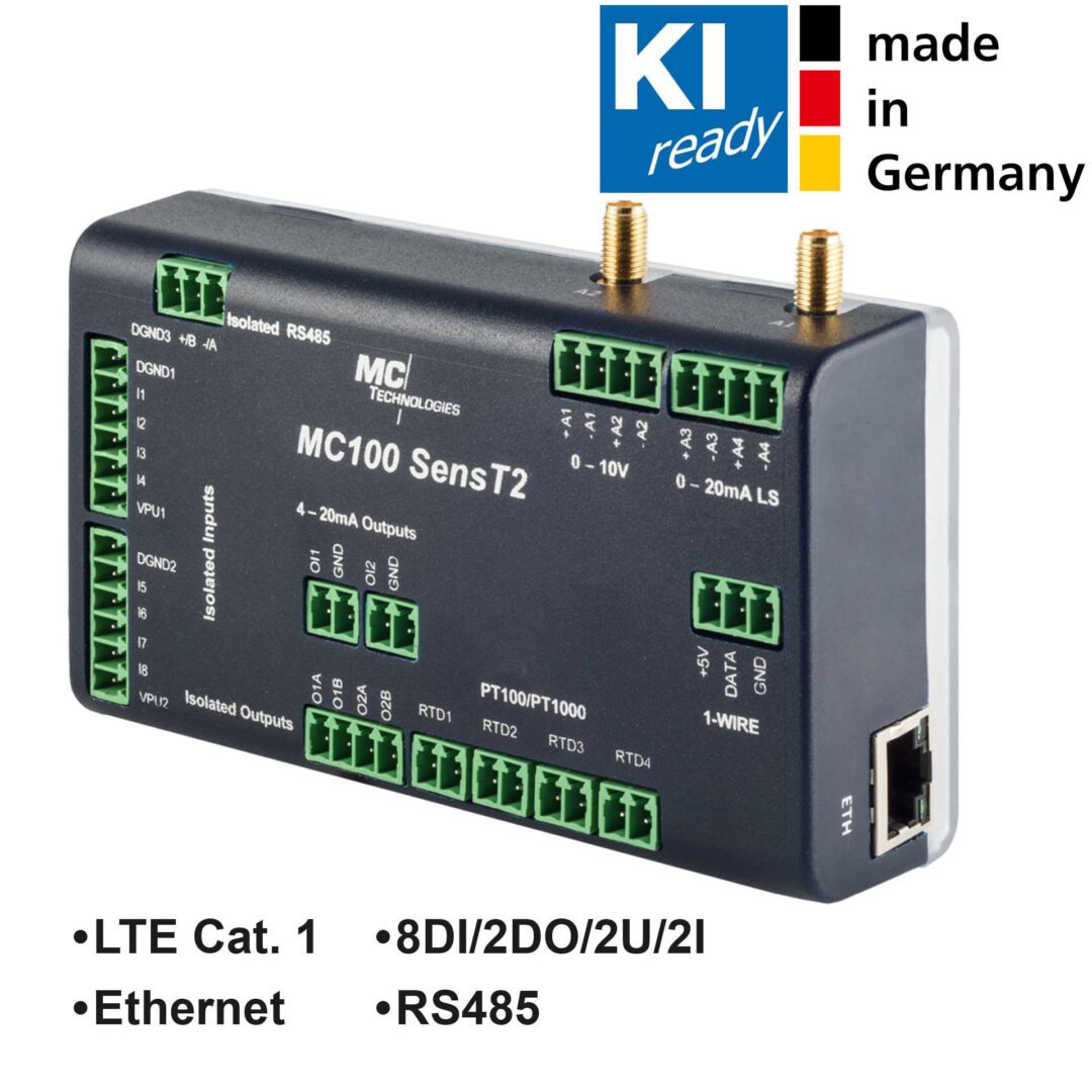 The MC100 SensT2 is equipped with LTE CAT1 for a fast internet connection and offers a variety of sensor interfaces such as various digital and analog inputs and outputs.
